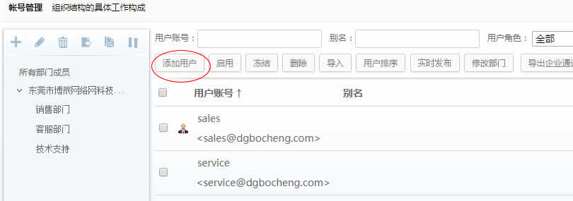 以管理员身份登录邮局管理员账号,在帐号管理页面上点击“”账号管理“”-“添加用户”,即可打开添加页面。