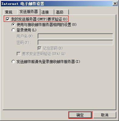 第七步,在弹窗中选择“发送服务器”子栏目,勾选“我的发送服务器要求验证”,点击“确定”